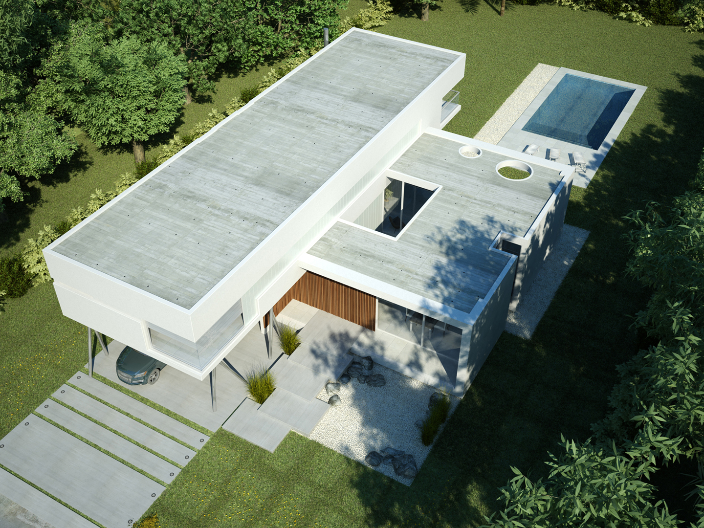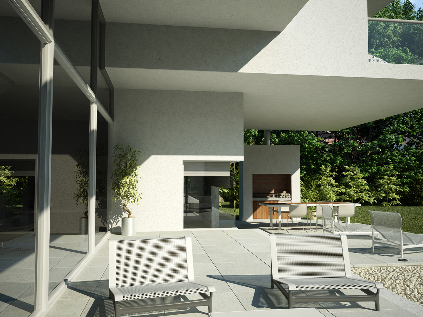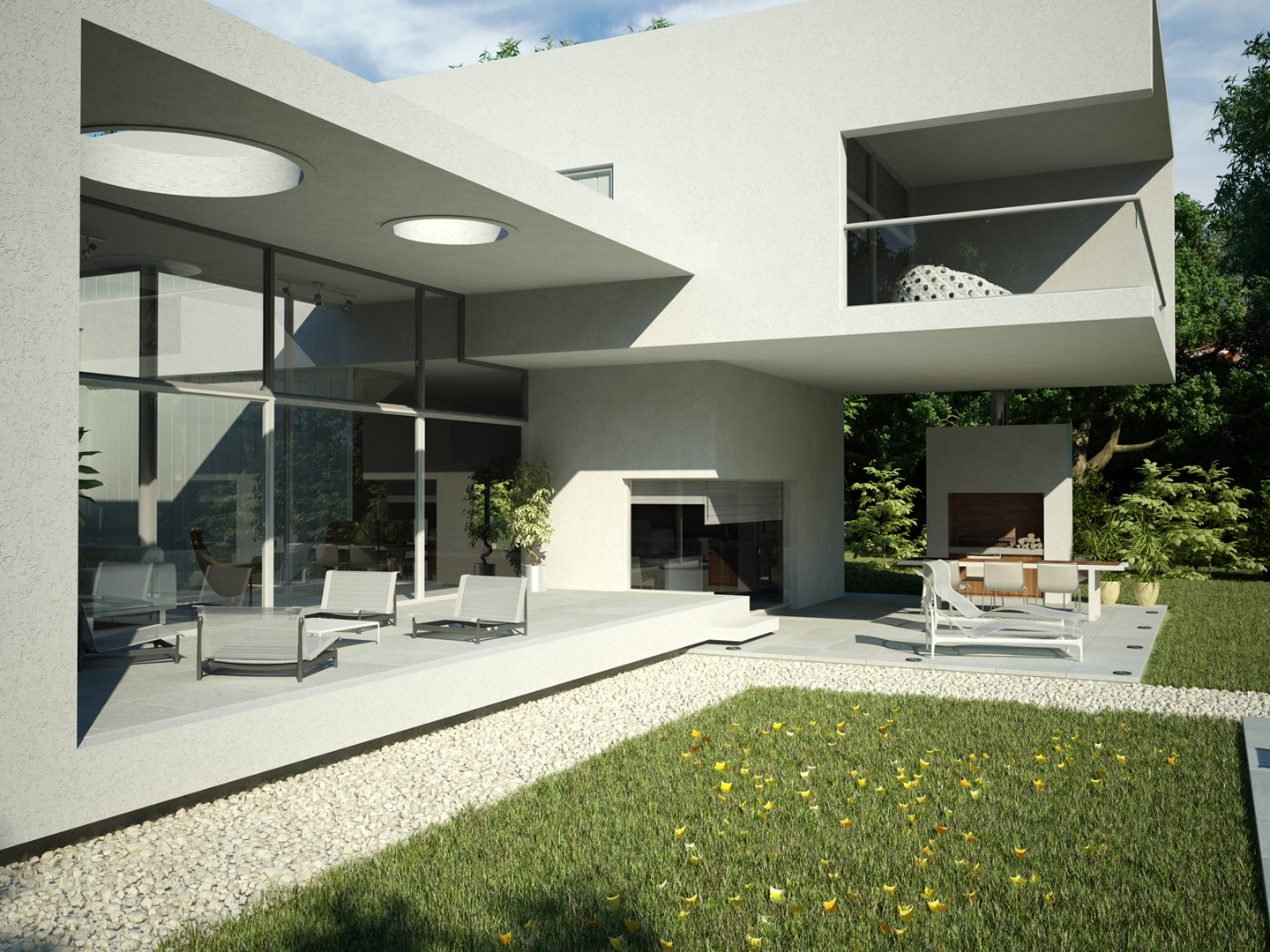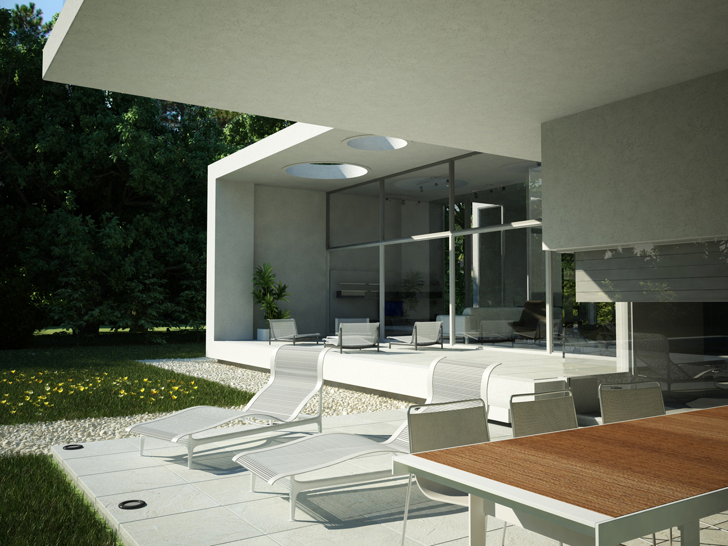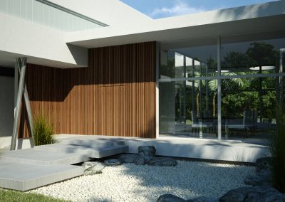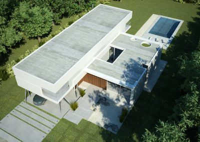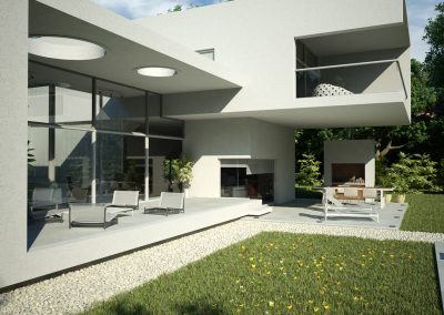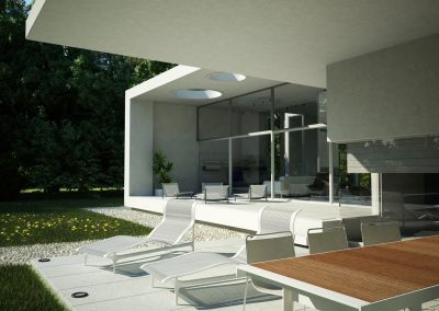 “Going back to nature”. A house is not only a correct and functional architectural volume but also that place where we feel we can be ourselves, we take refuge in it. Under these premises, we developed this project –a barrel vault with big cantilevers without columns, interrelated with an inverted C-shaped white stripe as from a central inner courtyard: the green heart of the house, the ordering axis by which spaces on the ground floor are developed, and vertical circulation. At the same time, this allows to incorporate the garden to the interior of the house, thus enhancing this in-out relationship. The articulation of these elements, which are very different between each other, but which are part of a whole, allows us to easily distinguish and delimit the uses and areas. The ‘stripe’ volume is suspended on the ground as a light element. This idea is emphasized during the evening, for the building is illuminated as from below its structure. This stripe has public use functions –living room, dining room and it also constitutes the wrap of its exterior expansion. These rooms are higher than the rest of the rooms, which conveys more relevance to the volume. On the other side of the central courtyard, we find the utility area. The top floor of the house is materialized in a large barrel vault challenging gravity by its large cantilever articulated with the rest of the rooms by the central courtyard, where we find the staircase. That volume represents the private area of the house, containing the bedrooms and the bathrooms. The own identity of the rooms, materialized in several volumes, allows to have a clear view of each of the internal function as from the outside.