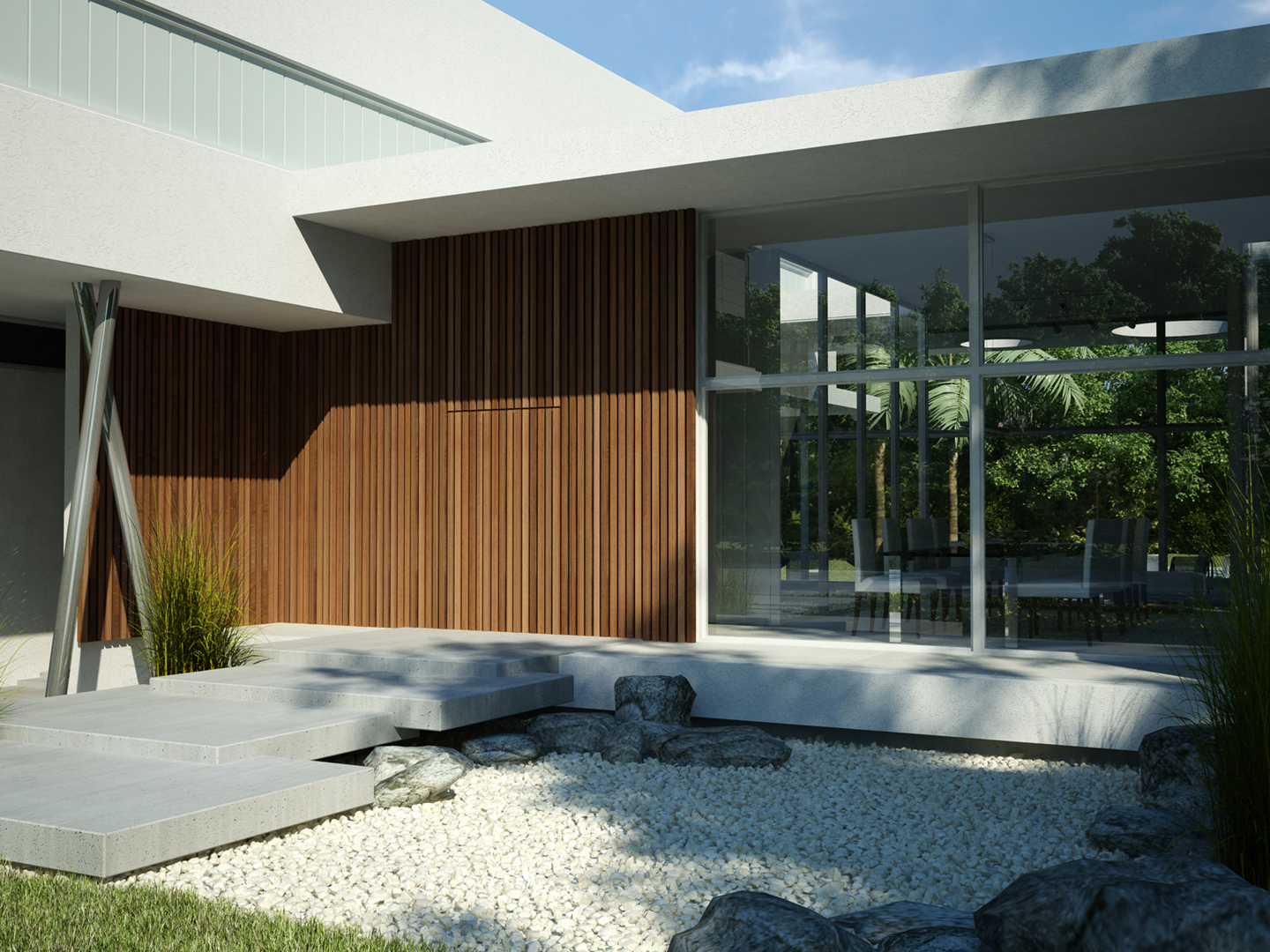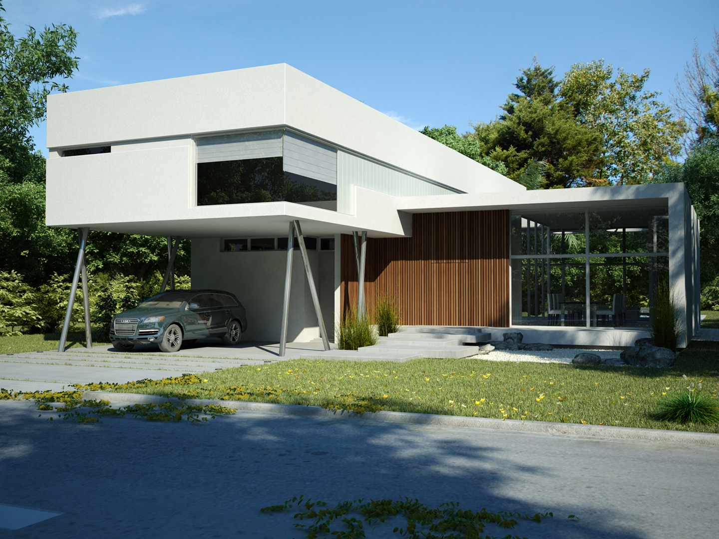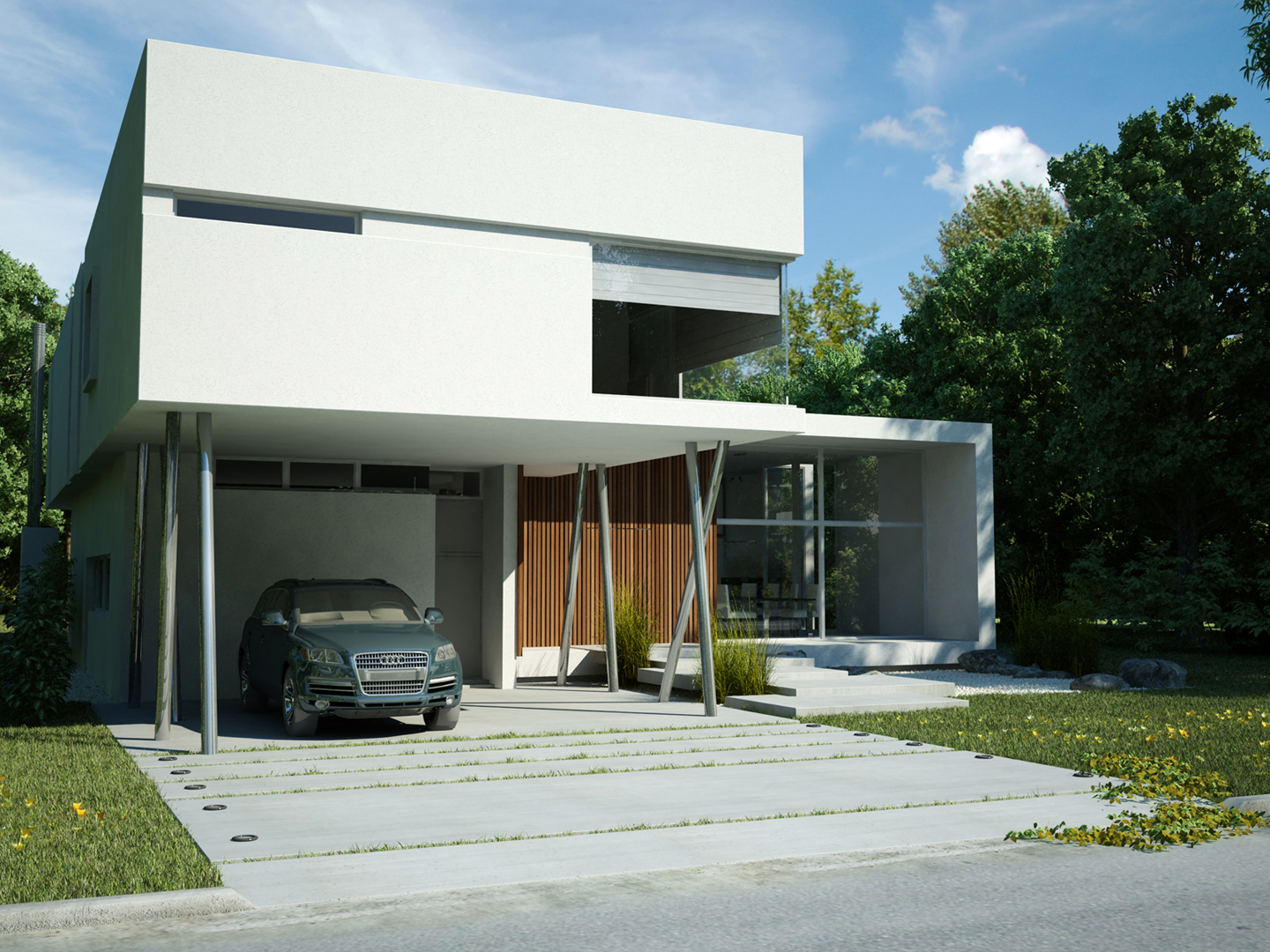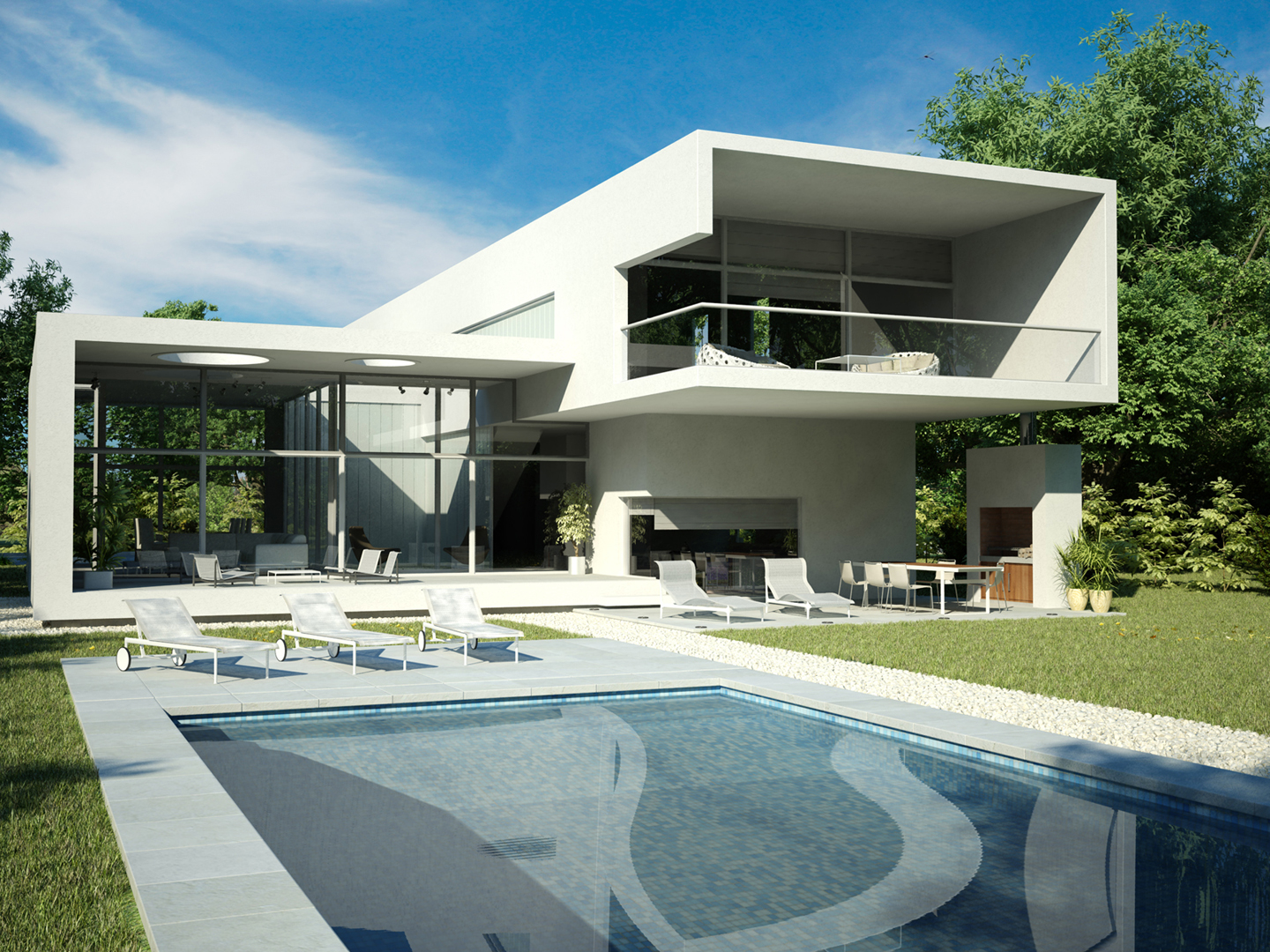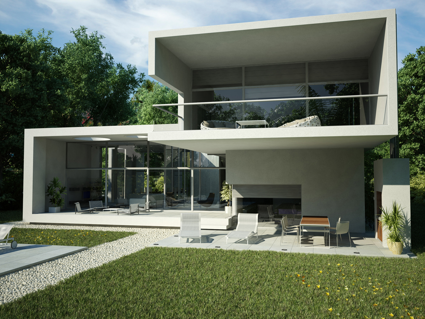 “Going back to nature”. A house is not only a correct and functional architectural volume but also that place where we feel we can be ourselves, we take refuge in it. Under these premises, we developed this project –a barrel vault with big cantilevers without columns, interrelated with an inverted C-shaped white stripe as from a central inner courtyard: the green heart of the house, the ordering axis by which spaces on the ground floor are developed, and vertical circulation. At the same time, this allows to incorporate the garden to the interior of the house, thus enhancing this in-out relationship. The articulation of these elements, which are very different between each other, but which are part of a whole, allows us to easily distinguish and delimit the uses and areas. The ‘stripe’ volume is suspended on the ground as a light element. This idea is emphasized during the evening, for the building is illuminated as from below its structure. This stripe has public use functions –living room, dining room and it also constitutes the wrap of its exterior expansion. These rooms are higher than the rest of the rooms, which conveys more relevance to the volume. On the other side of the central courtyard, we find the utility area. The top floor of the house is materialized in a large barrel vault challenging gravity by its large cantilever articulated with the rest of the rooms by the central courtyard, where we find the staircase. That volume represents the private area of the house, containing the bedrooms and the bathrooms. The own identity of the rooms, materialized in several volumes, allows to have a clear view of each of the internal function as from the outside.