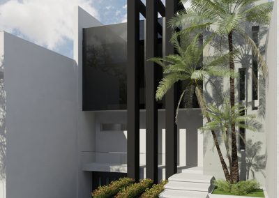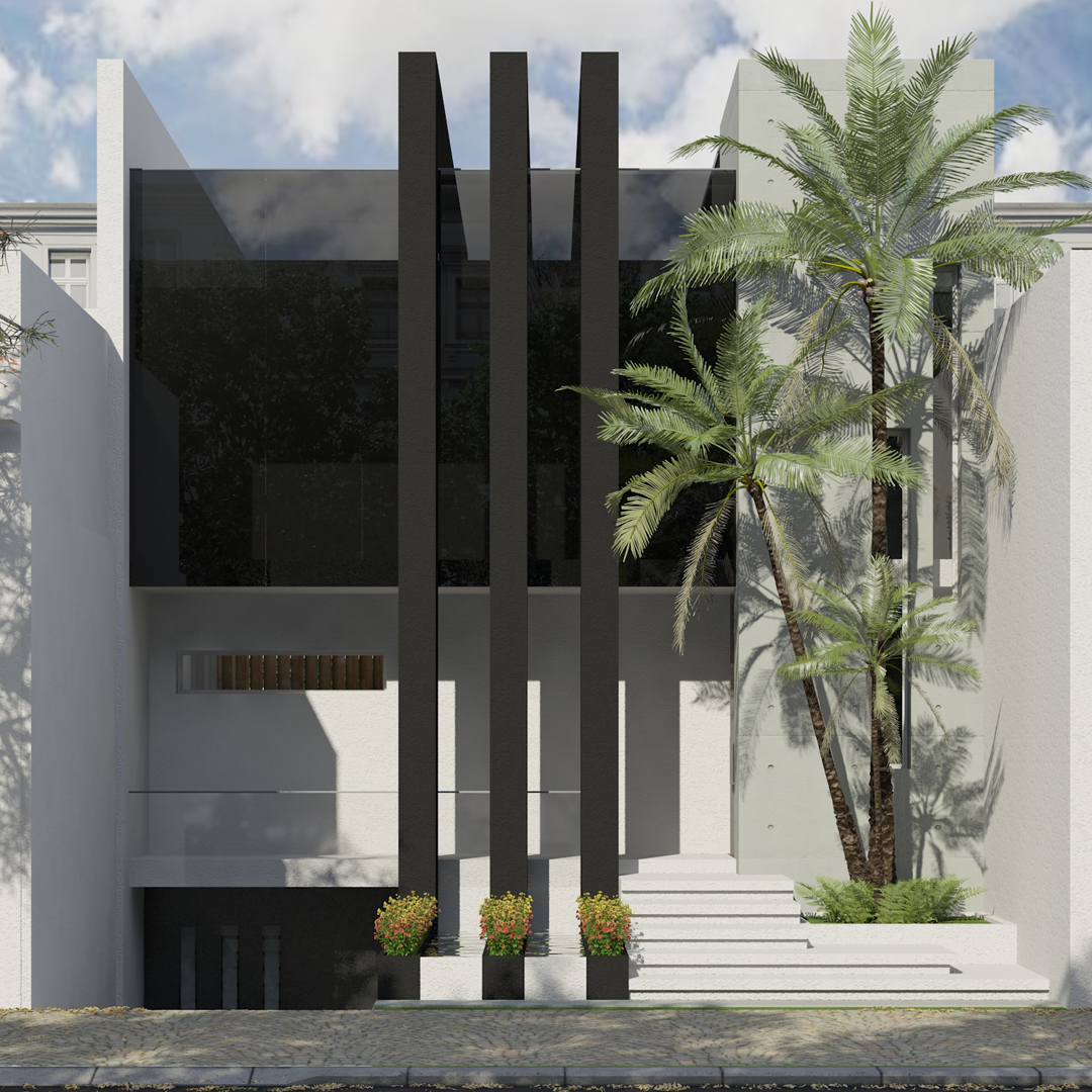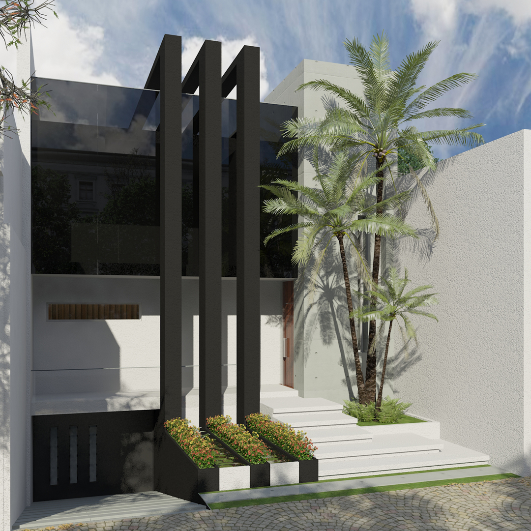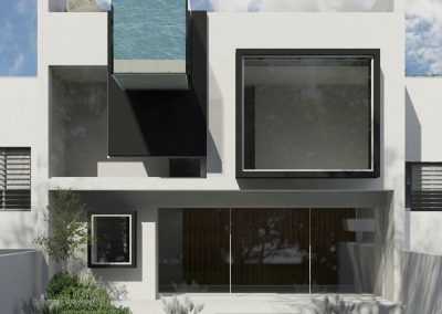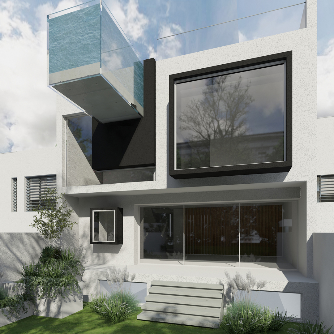With a strong identity, ML House is located in the Devoto neighborhood in Buenos Aires. The structure has geometric elements that organize the facade and make the access visible. This geometry solves the pergola on the terrace, where the solarium and grill space are located, and ends up being the structure of the pool. The swimming pool is suspended towards the quiet part of the building where the rear garden is located. The basement has the garage and a gym with a changing room. Through a vertical stair, you can access the public area on the ground floor, where all the main functions face to the outside garden. Finally, on the upper floor, three bedrooms were projected. Still being in the middle of the city and between party walls, the house presents an avant-garde aesthetic, and great views of the outer space.