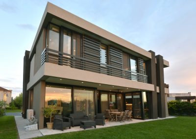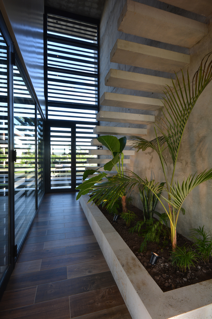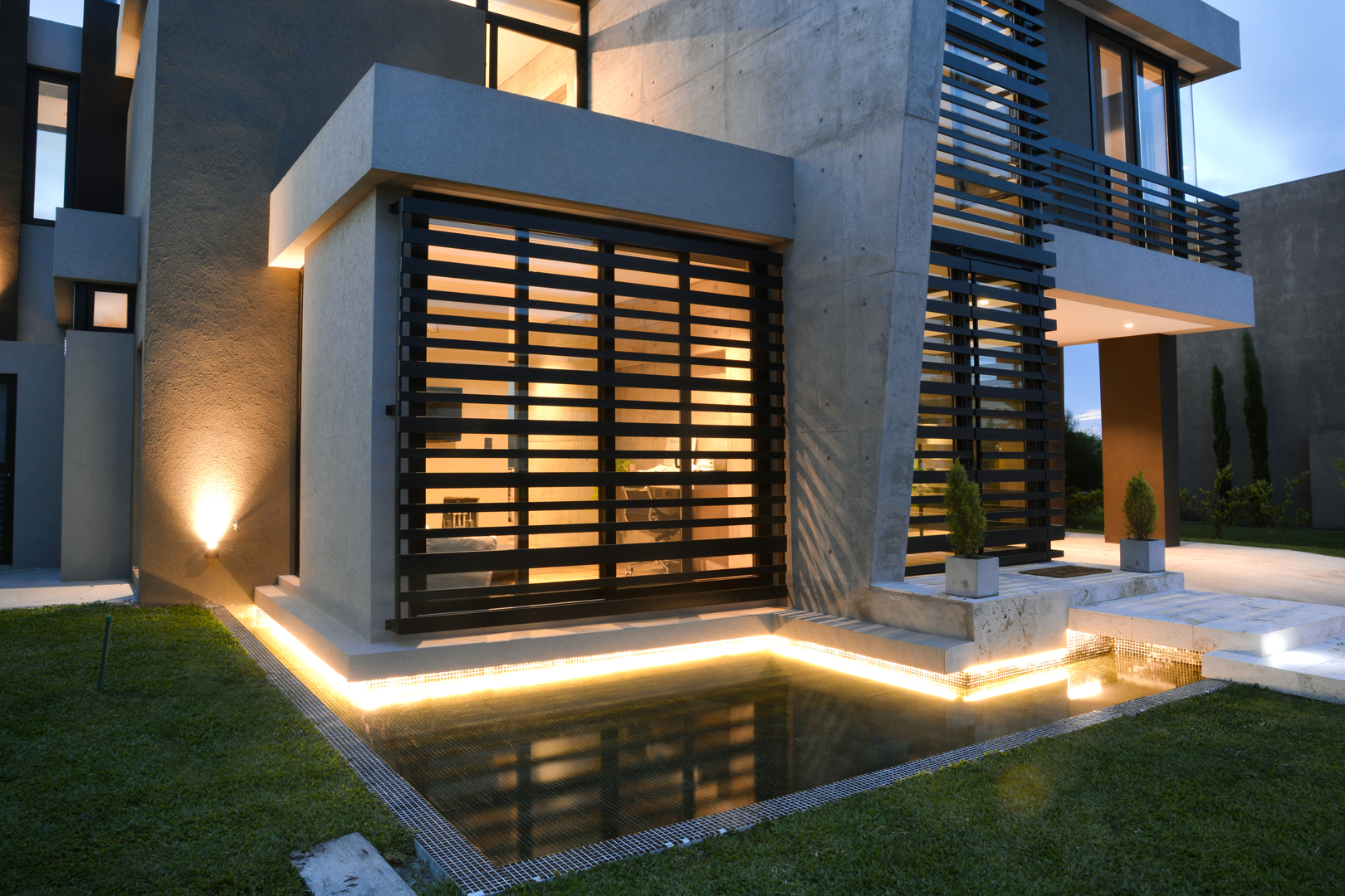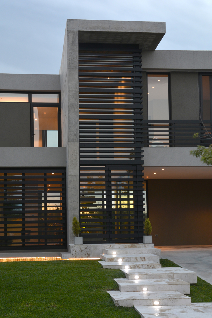 As protagonists of the great facade of concrete, the metal parasols give horizontality to the project, and a material value that refers to an industrial style. This element, provides privacy to the front, and highlights the contrast between this front and the back, where the windows either open to the views, and links the social area to the garden and the pool. The zen ambience of the solarium, proposes a relaxing atmosphere and comfort. On the ground floor, is an open space. Service areas like the kitchen – that with its imposing island opens to the dining room and the living room – turns it into a large social area. More intimately, the family room is placed towards the front side of the floor plan in order to isolate it acoustically. Upstairs, three large bedrooms make the most of the space and respect the architectural language that prevails throughout the house.