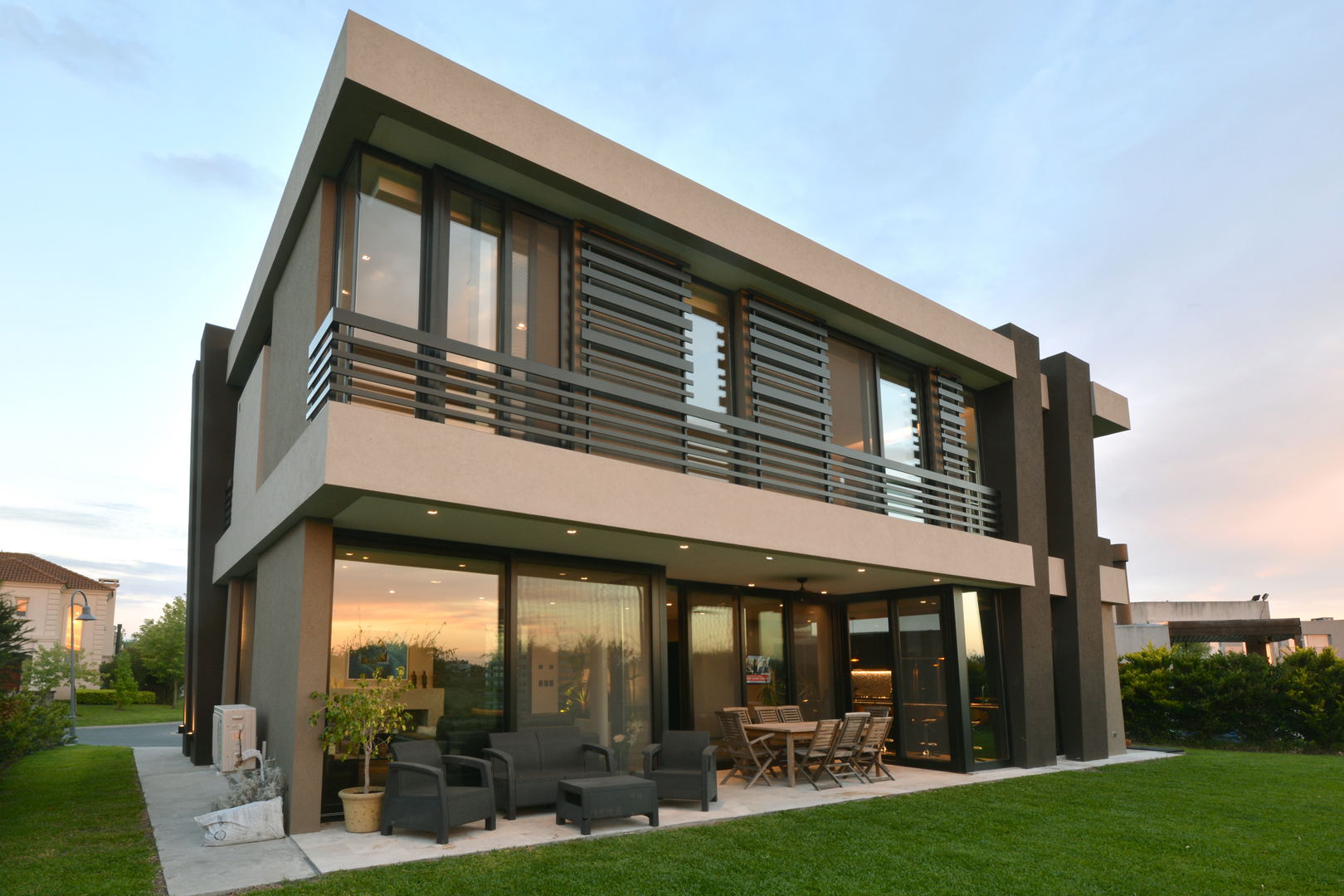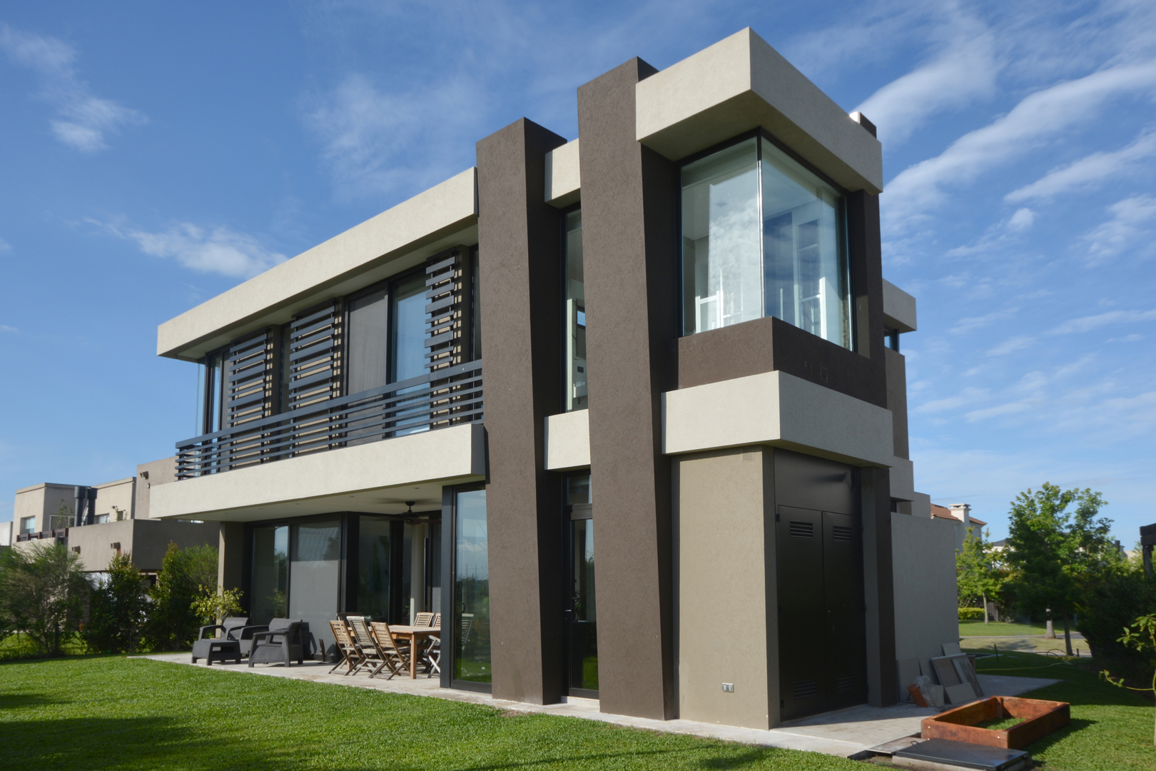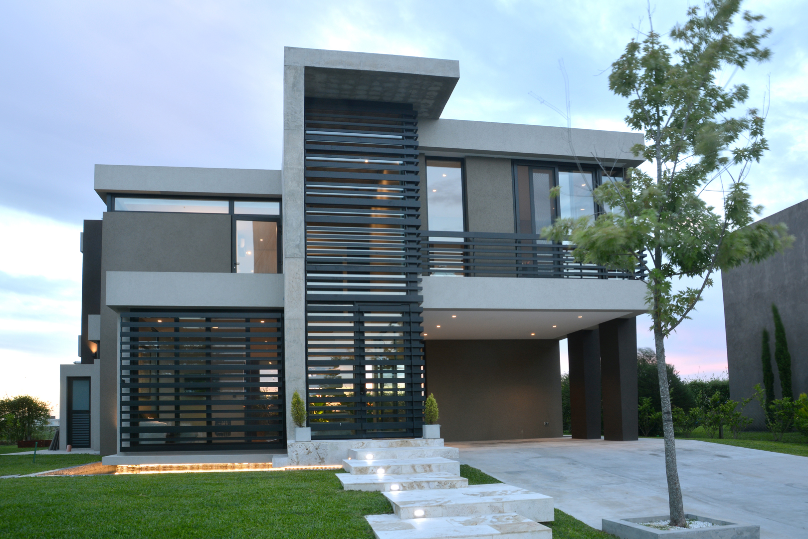 As protagonists of the great facade of concrete, the metal parasols give horizontality to the project, and a material value that refers to an industrial style. This element, provides privacy to the front, and highlights the contrast between this front and the back, where the windows either open to the views, and links the social area to the garden and the pool. The zen ambience of the solarium, proposes a relaxing atmosphere and comfort. On the ground floor, is an open space. Service areas like the kitchen – that with its imposing island opens to the dining room and the living room – turns it into a large social area. More intimately, the family room is placed towards the front side of the floor plan in order to isolate it acoustically. Upstairs, three large bedrooms make the most of the space and respect the architectural language that prevails throughout the house.