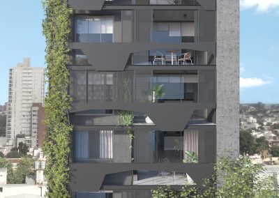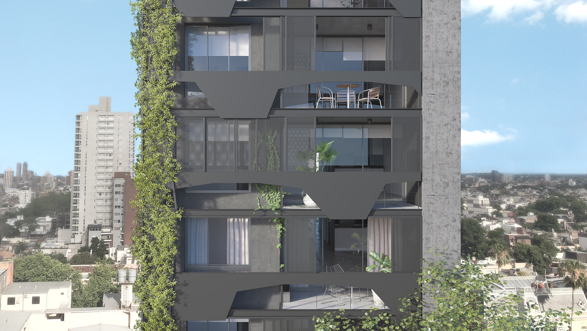 El edificio se erige con 8 niveles de departamentos en semipiso de 3 y 4 ambientes de gran espacio y confort. Las terrazas privadas de las unidades superiores (en dúplex y triplex) brindan espacios de amplia visual y una continuidad tanto del jardín parquizado como de los parques que se emplazan frente al edificio