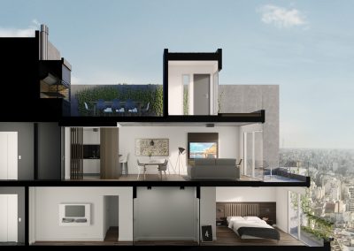 Las unidades de cuidadoso diseño interior y exterior cuentan con inmejorables terminaciones y gran calidad espacial, lo que transforma a éste edificio en un producto de alto valor agregado y único en su estilo.