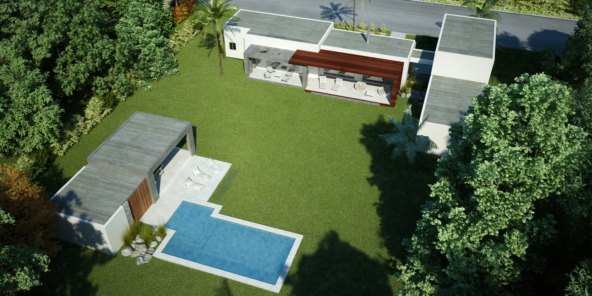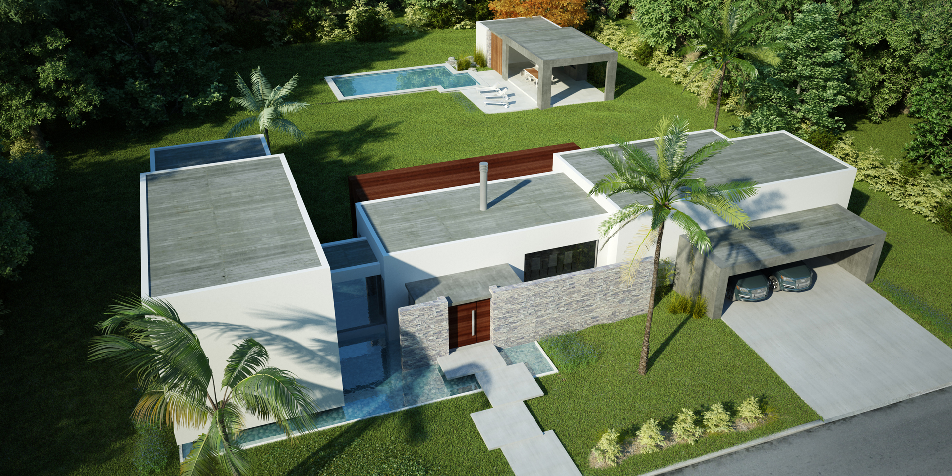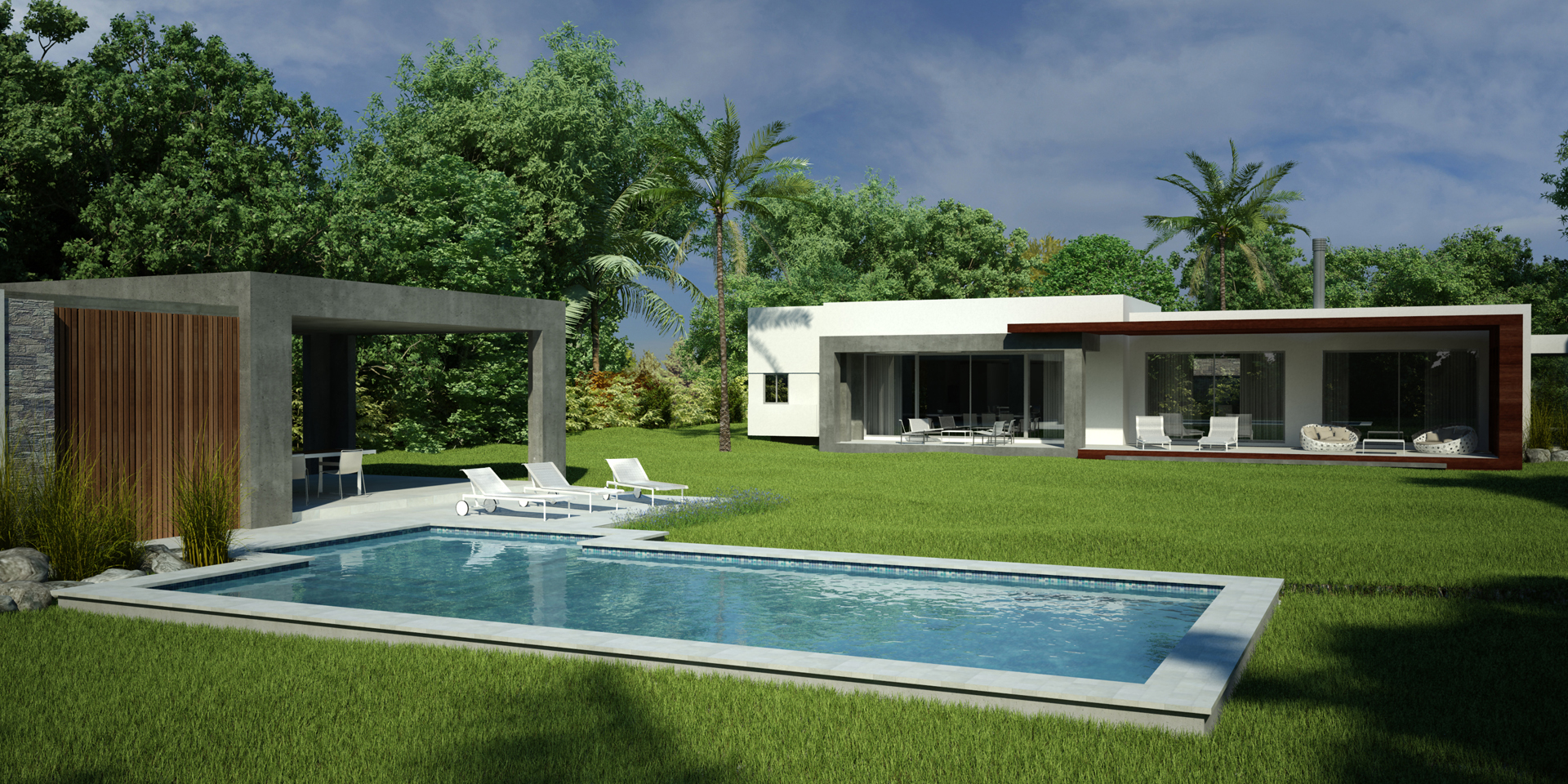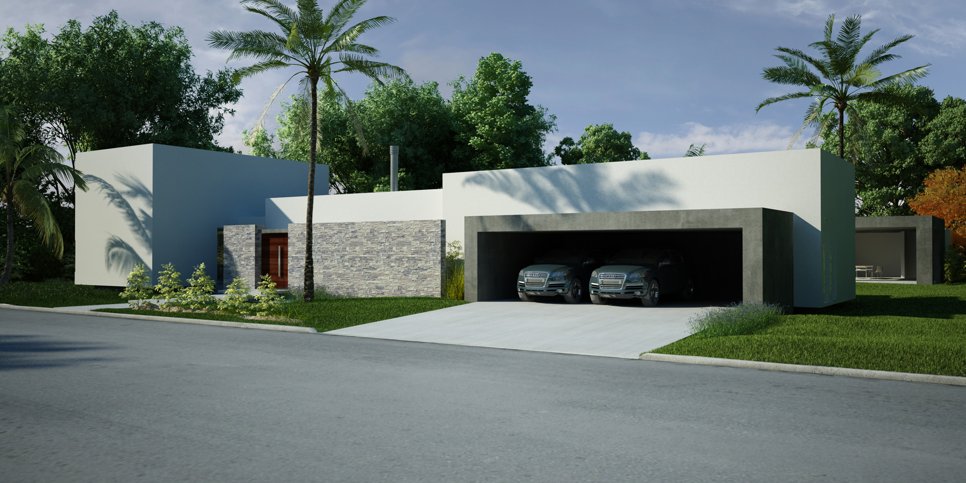 Las líneas horizontales predominan en el diseño minimalista, y la incorporación de “cajas huecas” que se adosan a los volúmenes principales, dando origen a garajes y galerías, otorga una resolución de simpleza y geometría.