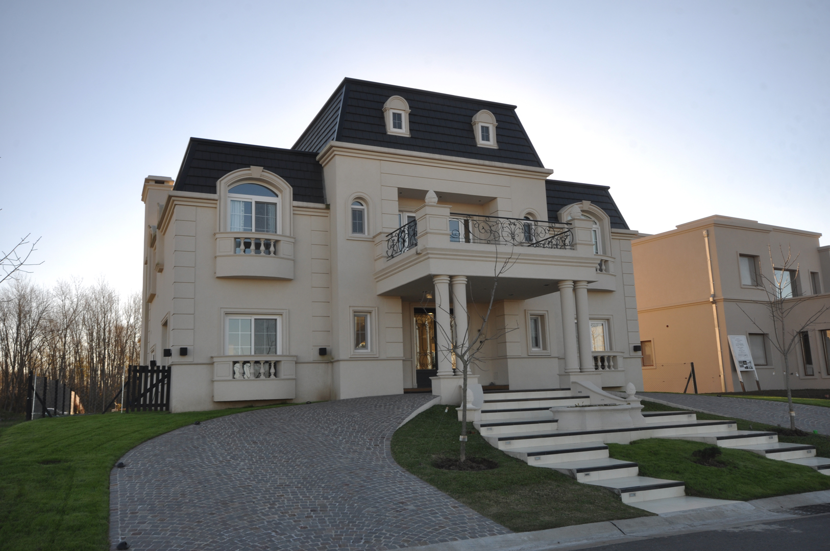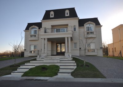 Mansarda, molduras, balcones, almohadillados, balustres, dan como resultado un estilo francés, con proporciones contemporáneas. Las arcadas de medio punto, sea en la planta alta como en las galerías, terminan de enmarcar la caja arquitectónica ornamentada. Las líneas rectas y simetrías del estilo no impidió que la piscina responda a una morfología orgánica, mimetizándose en cierta forma con el río. El eje de simetría que organiza a la planta, está materializado por el acceso, y a partir de dicho eje, se organizan las alas laterales que alojan diversas funciones: hacia la derecha, living y family, hacia la izquierda, cocina comedor diario. De esta forma se manejan las jerarquías de cada ambiente. En planta alta se encuentran los dormitorios, y un hall íntimo con expansión hacia un balcón con visuales hacia el frente. El altillo, aloja funciones de entretenimiento, bar y cine. La elegancia y los detalles artesanales, como por ejemplo la boiserie en cada ambiente, mantiene un cierto carácter histórico-francés, pero aún así, se adapta al confort y las tecnologías de hoy.