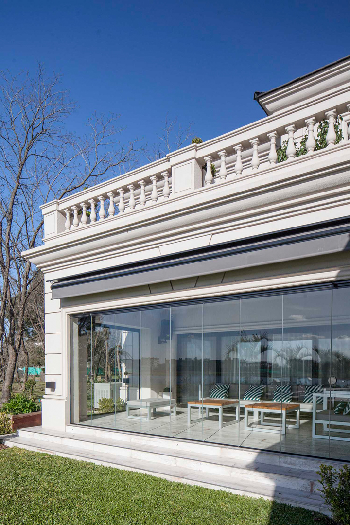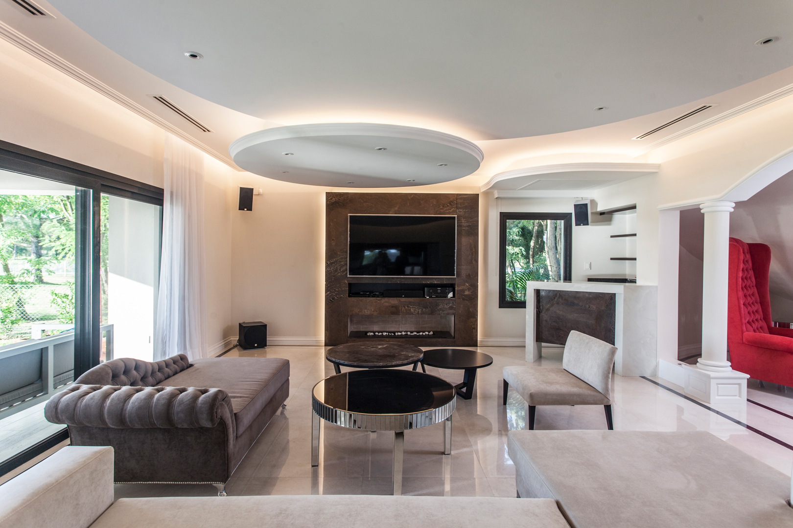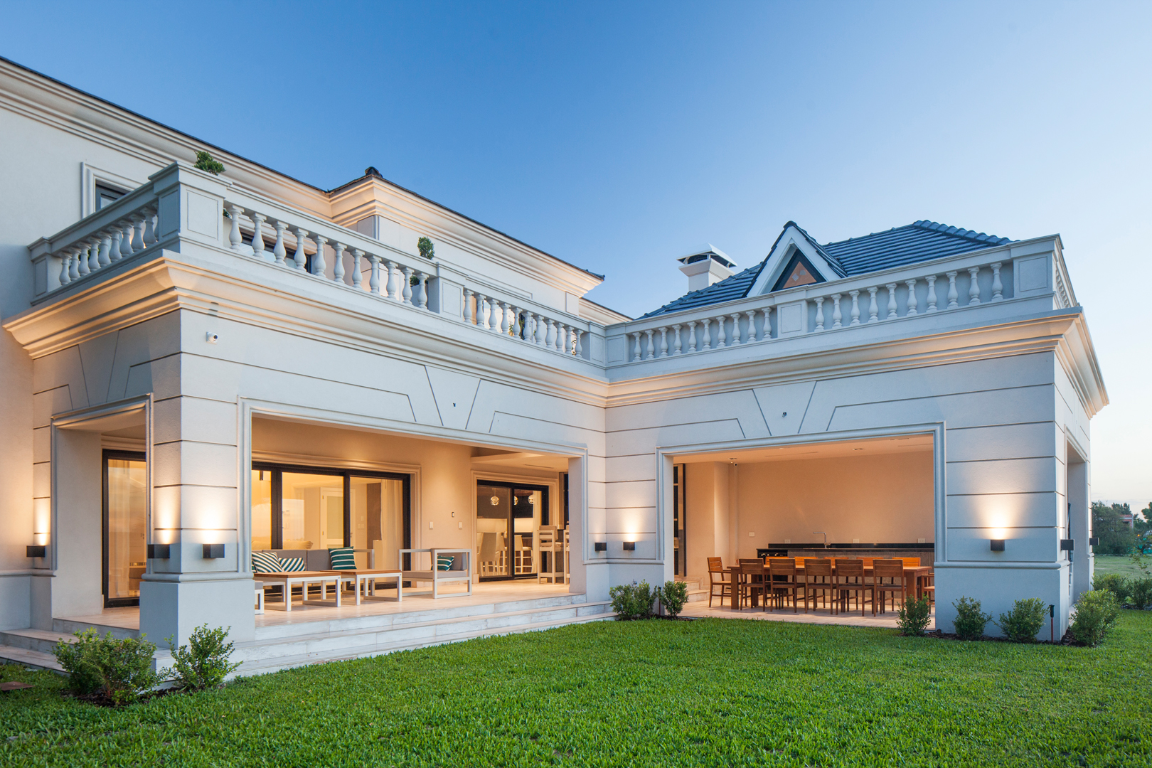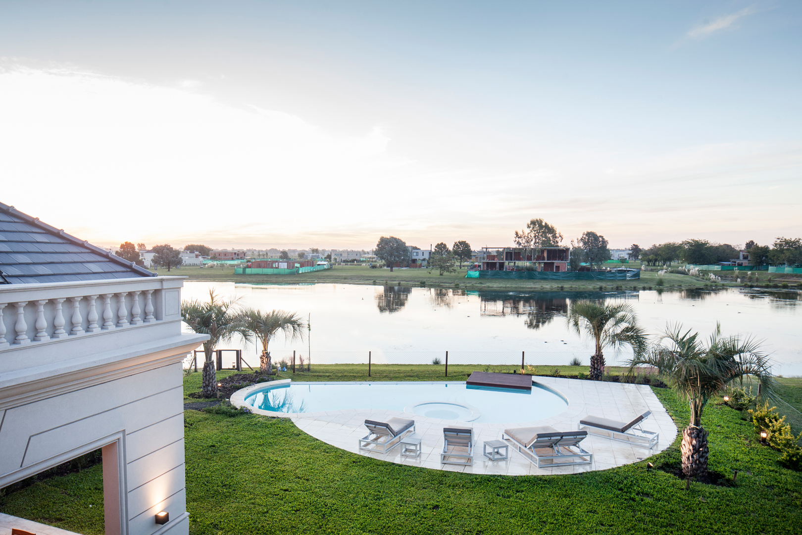 Un gran acceso enmarcado por la entrada imperial, nos da pistas de la elegancia con la que nos encontraremos en esta vivienda clásica. La composición del proyecto nos habla de una funcionalidad de carácter social. Un espacio de recepción de huéspedes, en donde los grandes protagonistas son el acceso con la imponente escalera de mármol, el living con grandes detalles en su cielorraso y el gran frente donde se eleva un hogar con terminaciones en mármol, y la cocina integrada al comedor principal. En la planta alta se organizan los usos privados: el dormitorio principal con vestidor y baño, y dormitorios de huéspedes. La galería, visualmente relacionada con la piscina y la laguna, funciona como área de parrilla, y sobre la misma se ubica la sala de usos múltiples, pensada para entretenimiento en general y eventos. En resumen, se trata de una vivienda que, sin perder la elegancia y calidad espacial, recibe con calidez a cada uno que la visite.