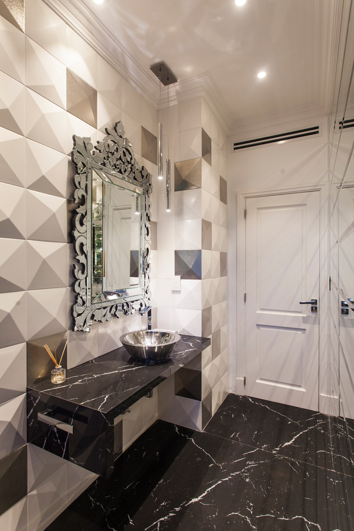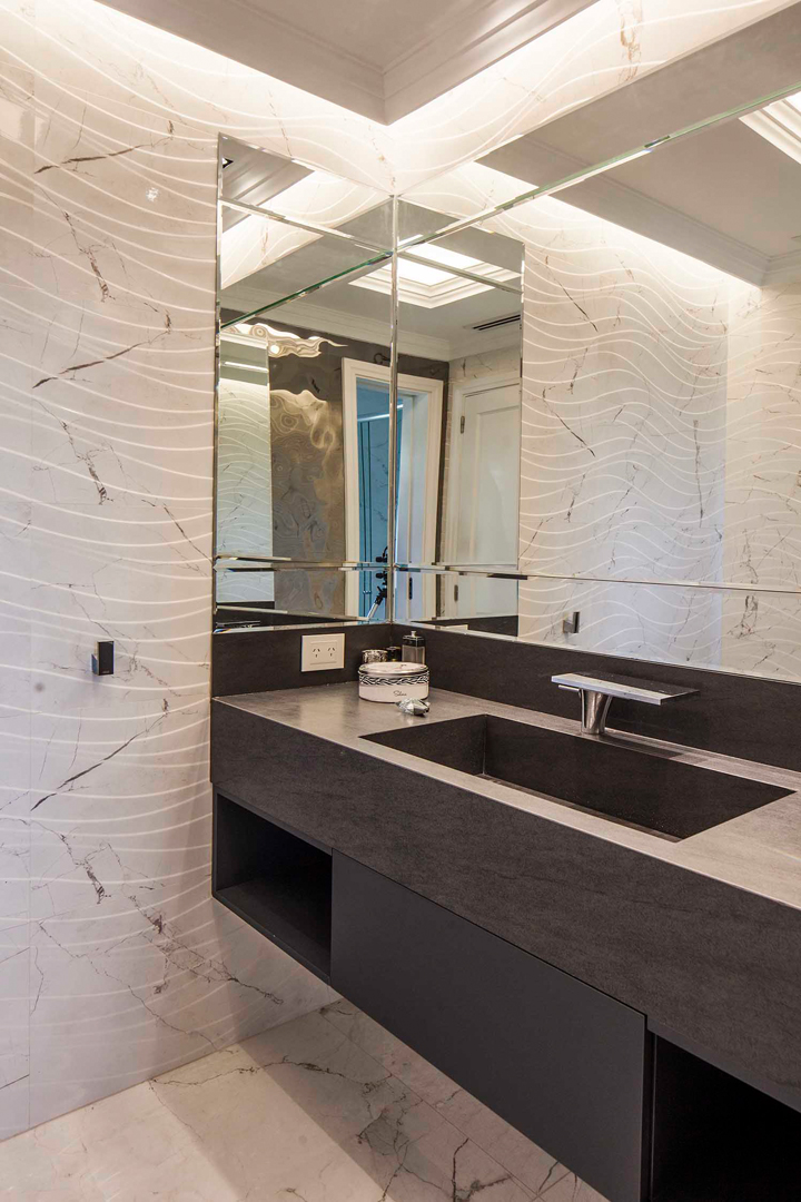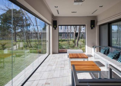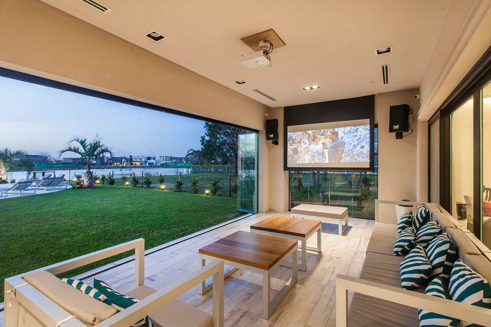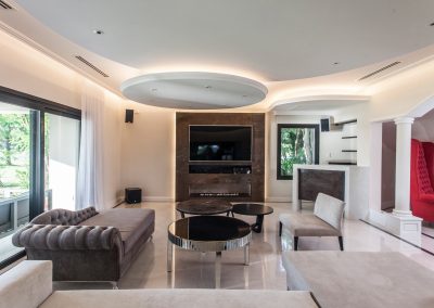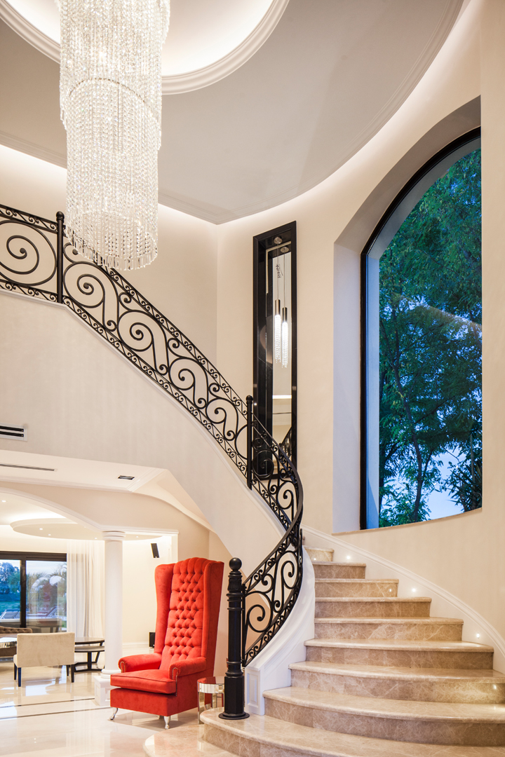 Un gran acceso enmarcado por la entrada imperial, nos da pistas de la elegancia con la que nos encontraremos en esta vivienda clásica. La composición del proyecto nos habla de una funcionalidad de carácter social. Un espacio de recepción de huéspedes, en donde los grandes protagonistas son el acceso con la imponente escalera de mármol, el living con grandes detalles en su cielorraso y el gran frente donde se eleva un hogar con terminaciones en mármol, y la cocina integrada al comedor principal. En la planta alta se organizan los usos privados: el dormitorio principal con vestidor y baño, y dormitorios de huéspedes. La galería, visualmente relacionada con la piscina y la laguna, funciona como área de parrilla, y sobre la misma se ubica la sala de usos múltiples, pensada para entretenimiento en general y eventos. En resumen, se trata de una vivienda que, sin perder la elegancia y calidad espacial, recibe con calidez a cada uno que la visite.
